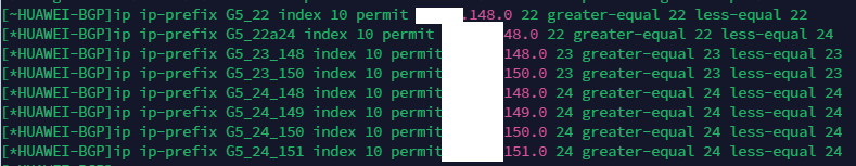 ip ip-prefix G5_22 index 10 permit 192.168.148.0 22 greater-equal 22 less-equal 22 ip ip-prefix G5_22a24 index 10 permit 192.168.148.0 22 greater-equal 22 less-equal 24 ip ip-prefix G5_23_148 index 10 permit 192.168.148.0 23 greater-equal 23 less-equal 23 ip ip-prefix G5_23_150 index 10 permit 192.168.150.0 23 greater-equal 23 less-equal 23 ip ip-prefix G5_24_148 index 10 permit 192.168.148.0 24 greater-equal 24 less-equal 24 ip ip-prefix G5_24_149 index 10 permit 192.168.149.0 24 greater-equal 24 less-equal 24 ip ip-prefix G5_24_150 index 10 permit 192.168.150.0 24 greater-equal 24 less-equal 24 ip ip-prefix G5_24_151 index 10 permit 192.168.151.0 24 greater-equal 24 less-equal 24