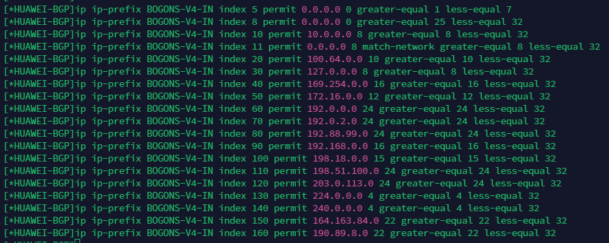 ip ip-prefix BOGONS-V4-IN index 5 permit 0.0.0.0 0 greater-equal 1 less-equal 7 ip ip-prefix BOGONS-V4-IN index 8 permit 0.0.0.0 0 greater-equal 25 less-equal 32 ip ip-prefix BOGONS-V4-IN index 10 permit 10.0.0.0 8 greater-equal 8 less-equal 32 ip ip-prefix BOGONS-V4-IN index 11 permit 0.0.0.0 8 match-network greater-equal 8 less-equal 32 ip ip-prefix BOGONS-V4-IN index 20 permit 100.64.0.0 10 greater-equal 10 less-equal 32 ip ip-prefix BOGONS-V4-IN index 30 permit 127.0.0.0 8 greater-equal 8 less-equal 32 ip ip-prefix BOGONS-V4-IN index 40 permit 169.254.0.0 16 greater-equal 16 less-equal 32 ip ip-prefix BOGONS-V4-IN index 50 permit 172.16.0.0 12 greater-equal 12 less-equal 32 ip ip-prefix BOGONS-V4-IN index 60 permit 192.0.0.0 24 greater-equal 24 less-equal 32 ip ip-prefix BOGONS-V4-IN index 70 permit 192.0.2.0 24 greater-equal 24 less-equal 32 ip ip-prefix BOGONS-V4-IN index 80 permit 192.88.99.0 24 greater-equal 24 less-equal 32 ip ip-prefix BOGONS-V4-IN index 90 permit 192.168.0.0 16 greater-equal 16 less-equal 32 ip ip-prefix BOGONS-V4-IN index 100 permit 198.18.0.0 15 greater-equal 15 less-equal 32 ip ip-prefix BOGONS-V4-IN index 110 permit 198.51.100.0 24 greater-equal 24 less-equal 32 ip ip-prefix BOGONS-V4-IN index 120 permit 203.0.113.0 24 greater-equal 24 less-equal 32 ip ip-prefix BOGONS-V4-IN index 130 permit 224.0.0.0 4 greater-equal 4 less-equal 32 ip ip-prefix BOGONS-V4-IN index 140 permit 240.0.0.0 4 greater-equal 4 less-equal 32 ip ip-prefix BOGONS-V4-IN index 150 permit 164.163.84.0 22 greater-equal 22 less-equal 32 ip ip-prefix BOGONS-V4-IN index 160 permit 190.89.8.0 22 greater-equal 22 less-equal 32