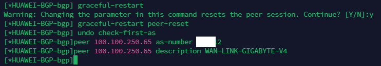 bgp 65100 graceful-restart y graceful-restart peer-reset undo check-first-as peer 100.100.250.65 as-number 65000 peer 100.100.250.65 description WAN-LINK-GIGABYTE-V4 comm