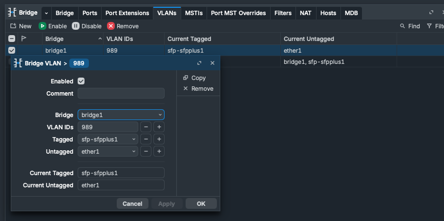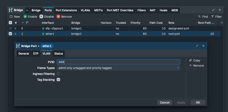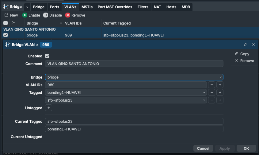 Aqui estou dizendo que tudo que chegar nessa vlan 989, ate com marcações de vlans no pacote, vai ser aceito.